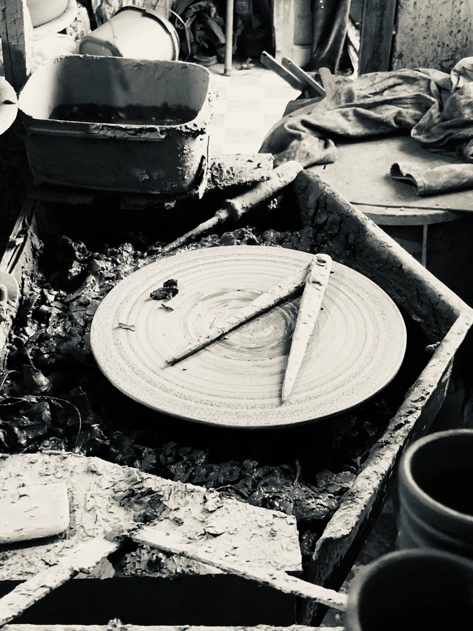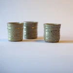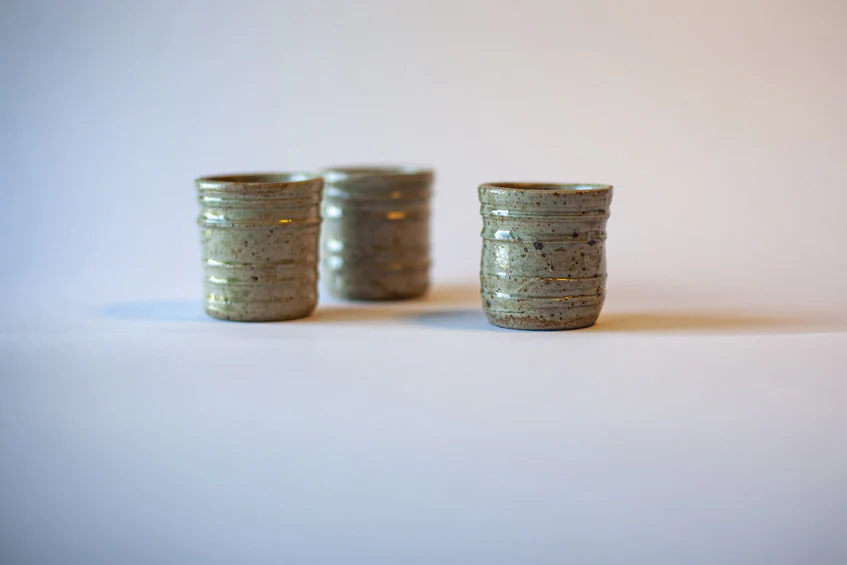 Après les étapes de tournage, de séchage et de grattage, chaque pièce est émaillée à la cendre de bois. Il récupère les cendres du poêle à bois qu’il lave et tamise ; puis les met dans une bassine d’eau pour y trempe les pièces une à une.